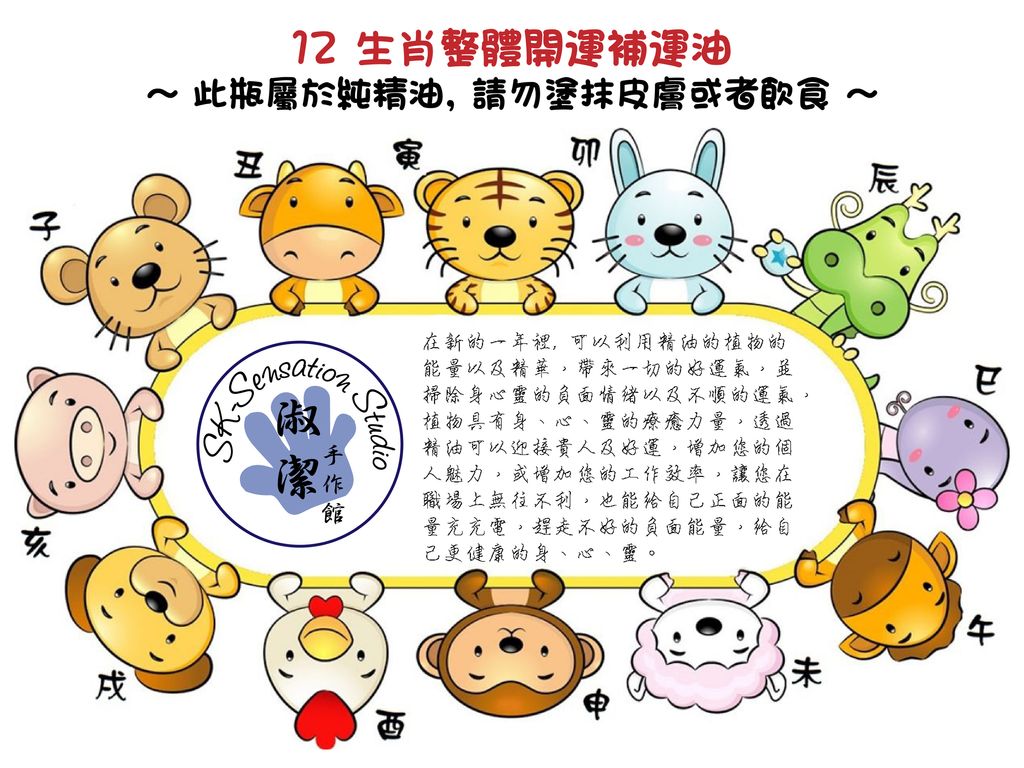 館主不是玄學家,不是命理學家,但是館主是個國際臨床芳療師,可以調配一些開運精油給各大生肖懸掛在身以便可以達到運程互補以及提升的作用。今年館主細心的為大家進行前所未有的洞悉卡抽卡形式,為 12 生肖抽出屬於那個生肖的開運精油洞悉卡,並進行了解說!