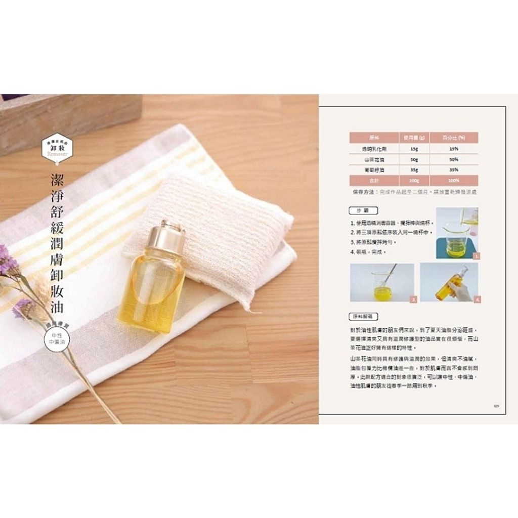 4.單品保養品不同功用:配方中會說明適合使用的膚質,讓喜愛手作的朋友不但可以挑選屬於自己的保養品,也能為家人自製,實實在在提供大家參考。